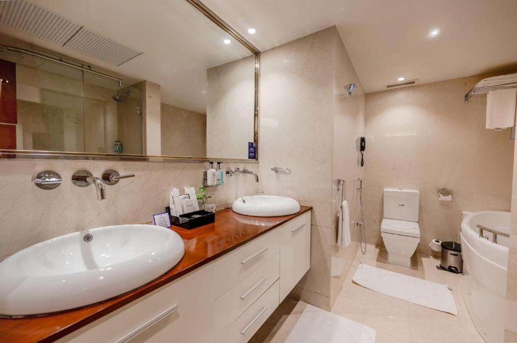 Karpet lantai merah dan lampu tersembunyi memberikan nuansa hangat pada kamar-kamar ber-AC-nya. Setiap kamar dilengkapi TV satelit layar datar dan pemutar DVD. Kamar mandi pribadinya memiliki wastafel ganda.